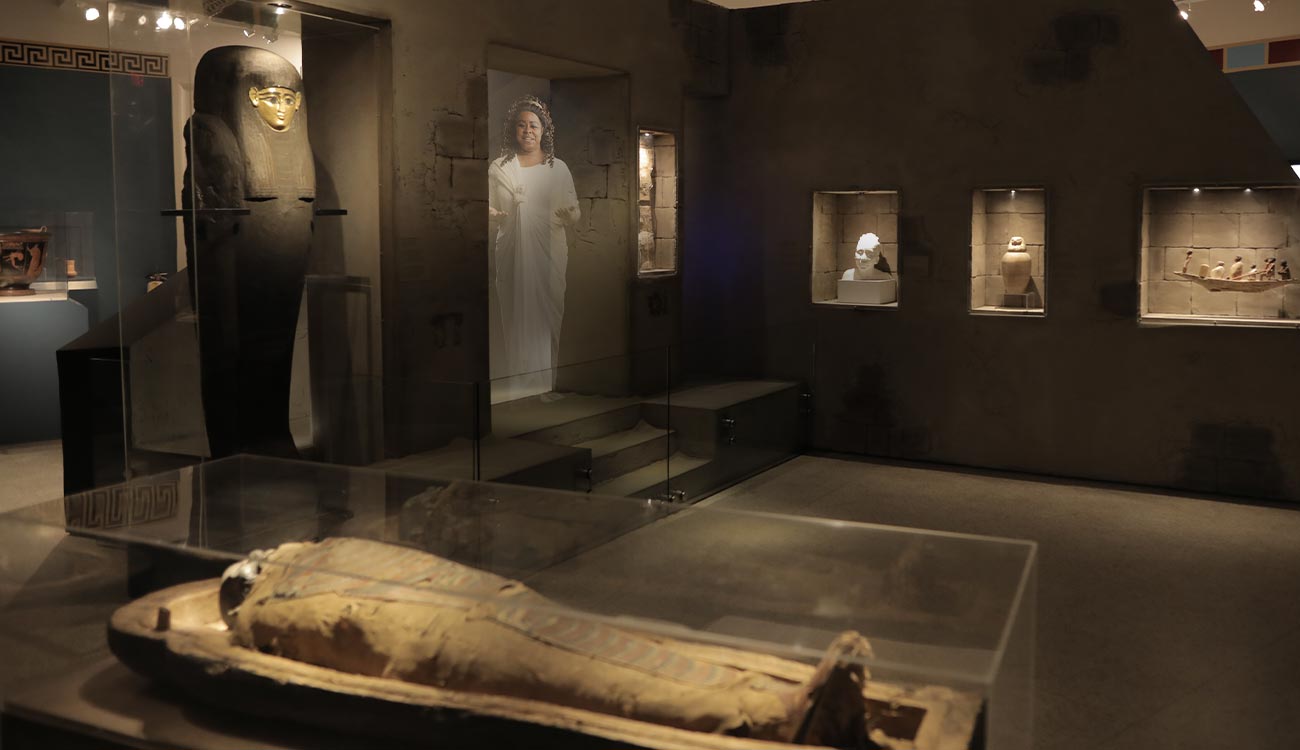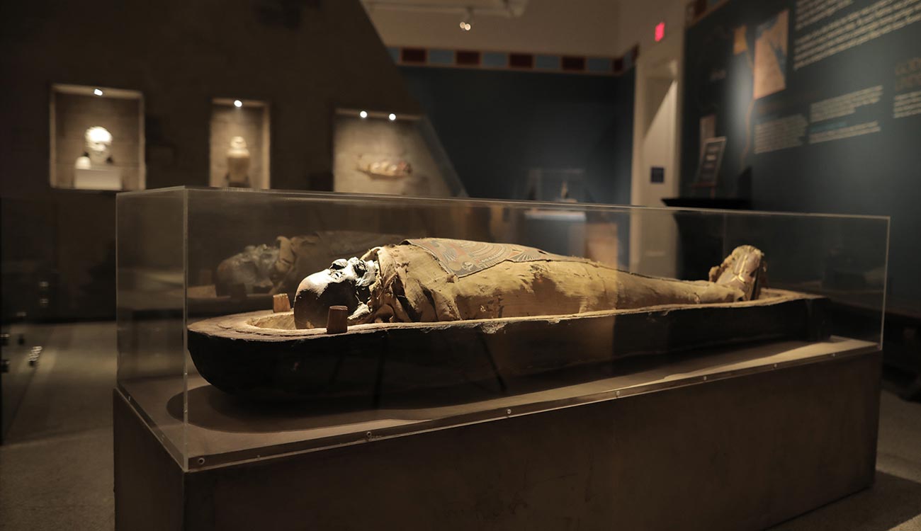 The centerpiece of this gallery is Nefrina, RPM’s Ptolemaic period mummy, with original ornamented sarcophagus and cartonnage mummy trappings. Other highlights include over a dozen remarkable pictorial Greek vessels including geometric and red and black figure styles in the form of hydrias, column kraters, bell kraters, stamnoi, and amphorae depicting heroes, gods, and mythic narratives, some dating as early as the 8th century BC; several Egyptian relief carved stele fragments portraying gods and hieroglyphs; Classical marble heads; glassware, jewelry, and everyday objects.