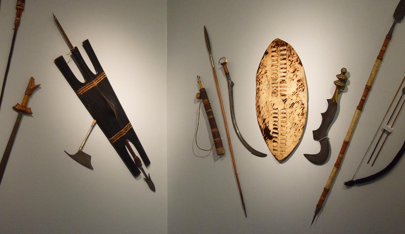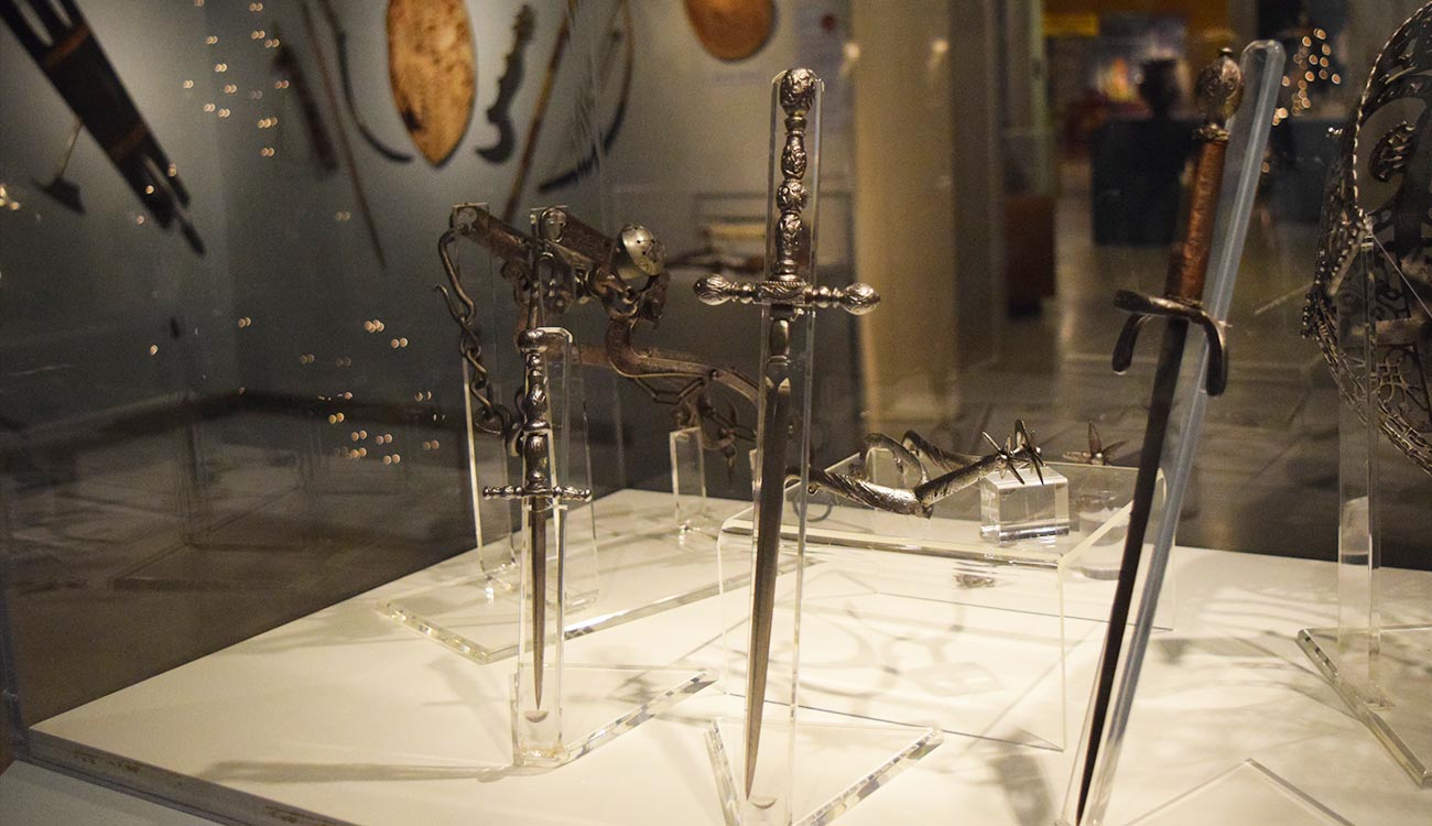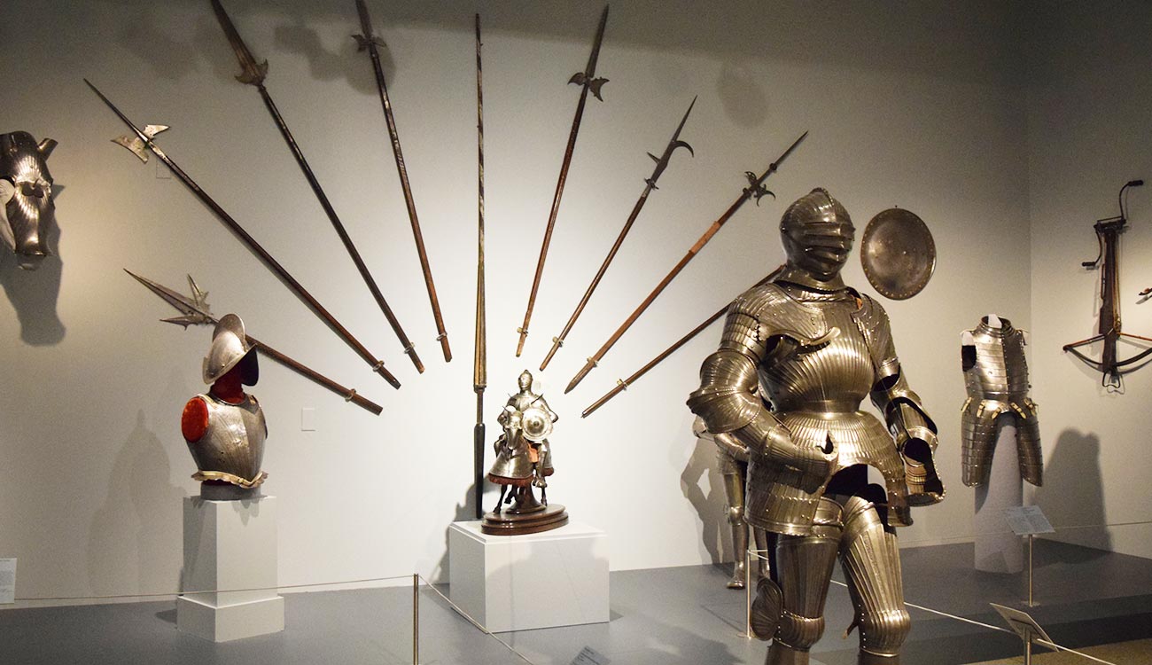 This gallery features armor and weaponry from Europe (ancient through 19th century), Oceania, Africa, Asia, and the Persian Empire. Some highlights include an impressive full Maximilian-style suit of armor from Germany, circa 1520-30; a highly ornamented mid-17th century German horse muzzle; a variety of pole arms, swords, and horse armor elements; a 17th-century composite three-quarter armor for a cuirassier; a German close helmet and a late-16th-century burgonet; a complete armor for a Japanese samurai; intricate Persian arm guards, shield, and helmet; and jewel-encrusted daggers.