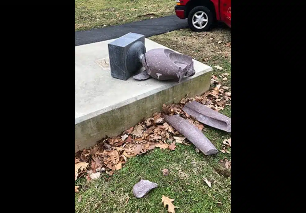 The most recent vandalism destroyed a sculpture entitled Duetby artist Miklos L. Sebek. The sculpture was a gift to The Museum from the artist back in 2018. In addition, several benches in Trudy’s Garden, a dedicated memorial in the Arboretum, were turned over and extensively damaged. Signage was also ripped out and other items were tossed into the Wyomissing creek. The extent of the recent damage to the Arboretum has not yet been ascertained, but is estimated to be approaching $100,000.