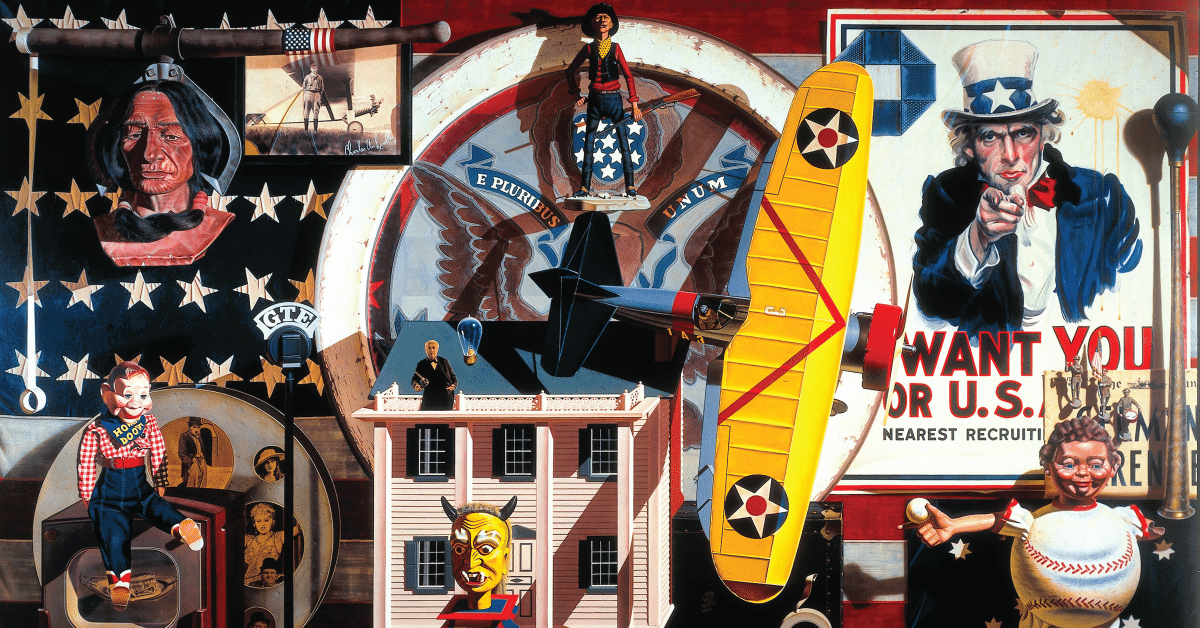 Gary Erbe (American, b. 1944) has been painting the theme of the American Flag in his still life compositions for over fifty years. In the lead up to the Nation’s Bicentennial in 1976, the artist set out to commemorate the achievement in two monumental canvases. Those works are included in this fifty-year retrospective titled, Gary Erbe: Magical World. The engaging exhibition includes fifty works — both paintings and finished assemblages (models for the paintings) — with more than a dozen that feature the American flag. The American flag is a particularly timely subject as the nation looks ahead to the Semiquincentennial, marking 250 years since the signing of the Declaration of Independence.