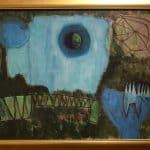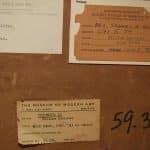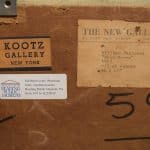 Moon Forms, an oil on canvas from 1947, a recent gift of Irv and Lois Cohen, is an extraordinary exploration of color, line and gesture from his mature period, but on the back of the painting, we find evidence of its past. There are no less than 10 old labels on the back of the painting, some of which tell the story of who once owned the painting—or, more accurately, dealers who at one time offered the painting for sale. The painting made its debut in 1947 at the Kootz Gallery in New York City, where it hung among sixteen other paintings by Baziotes. Subsequently, the painting passed through a series of art dealers throughout its history including The New Gallery and the James Goodman Gallery in New York; the Paul Kantor Gallery in Beverly Hills; and B. C. Holland in Chicago. Labels from each of these dealers appear on the back of the Moon Forms canvas.