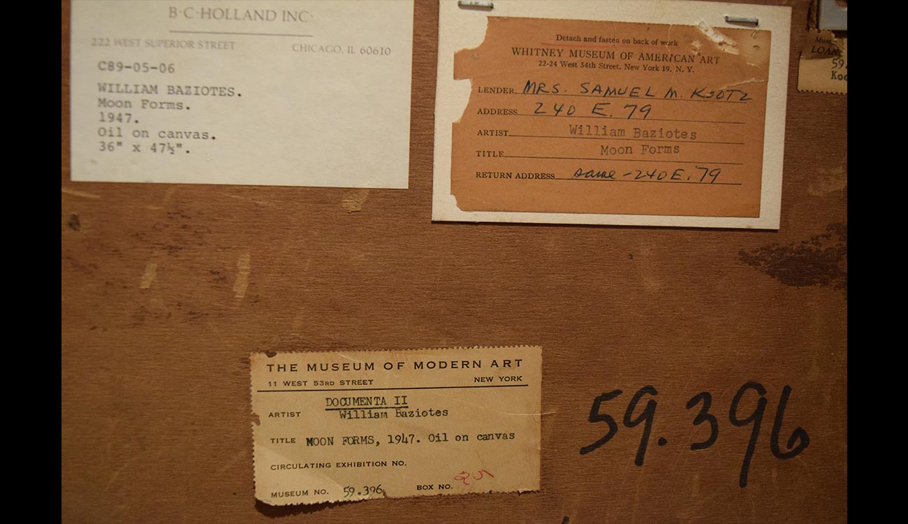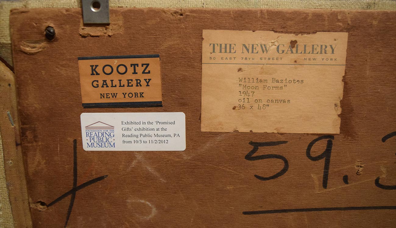 Moon Forms, an oil on canvas from 1947, a recent gift of Irv and Lois Cohen, is an extraordinary exploration of color, line and gesture from his mature period, but on the back of the painting, we find evidence of its past. There are no less than 10 old labels on the back of the painting, some of which tell the story of who once owned the painting—or, more accurately, dealers who at one time offered the painting for sale. The painting made its debut in 1947 at the Kootz Gallery in New York City, where it hung among sixteen other paintings by Baziotes. Subsequently, the painting passed through a series of art dealers throughout its history including The New Gallery and the James Goodman Gallery in New York; the Paul Kantor Gallery in Beverly Hills; and B. C. Holland in Chicago. Labels from each of these dealers appear on the back of the Moon Forms canvas.